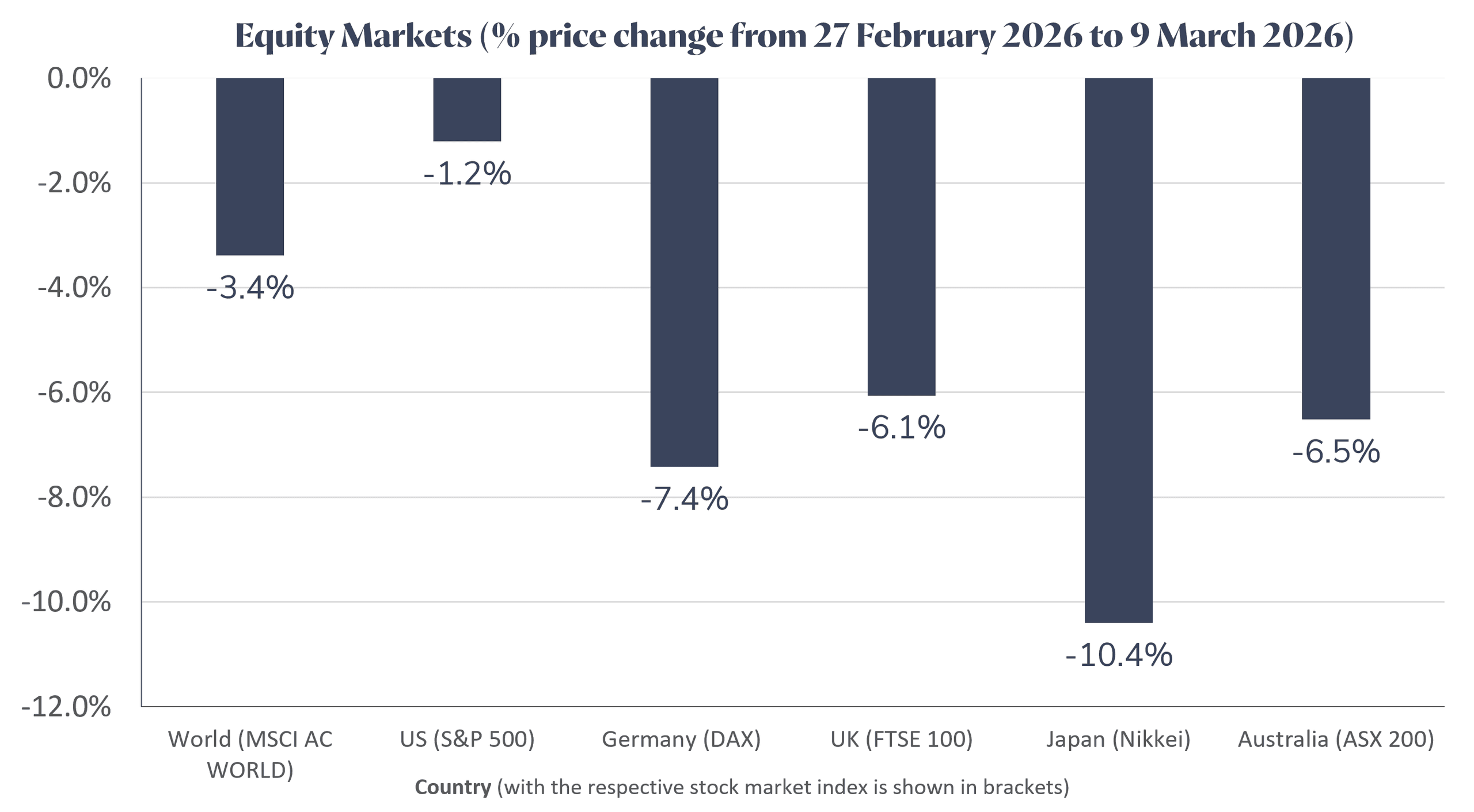 As a result, equity markets have fallen, especially in countries that rely heavily on oil from the Middle East. In local currency terms, the MSCI All Countries Index fell 3.4% between 27 February (last trading day before the conflict commenced) and 9 March 2026. All the markets shown in the chart below, except the US, dropped at least 6%. The US performed better partly because it is less dependent on imported energy.
